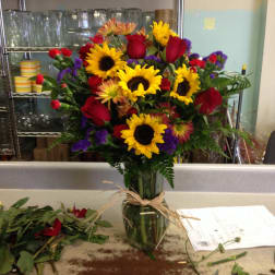 Price: $56.99Sunflower, roses, Mini carnations and static
